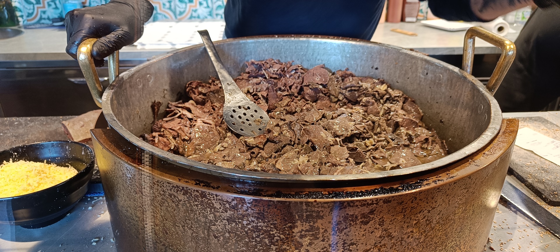 A Porta Carbone abbiamo scelto la focaccia accompagna da caciocavallo. Qui mentre la milza viene mantecata nel pentolone a soffriggere e durante la preparazione della focaccia.