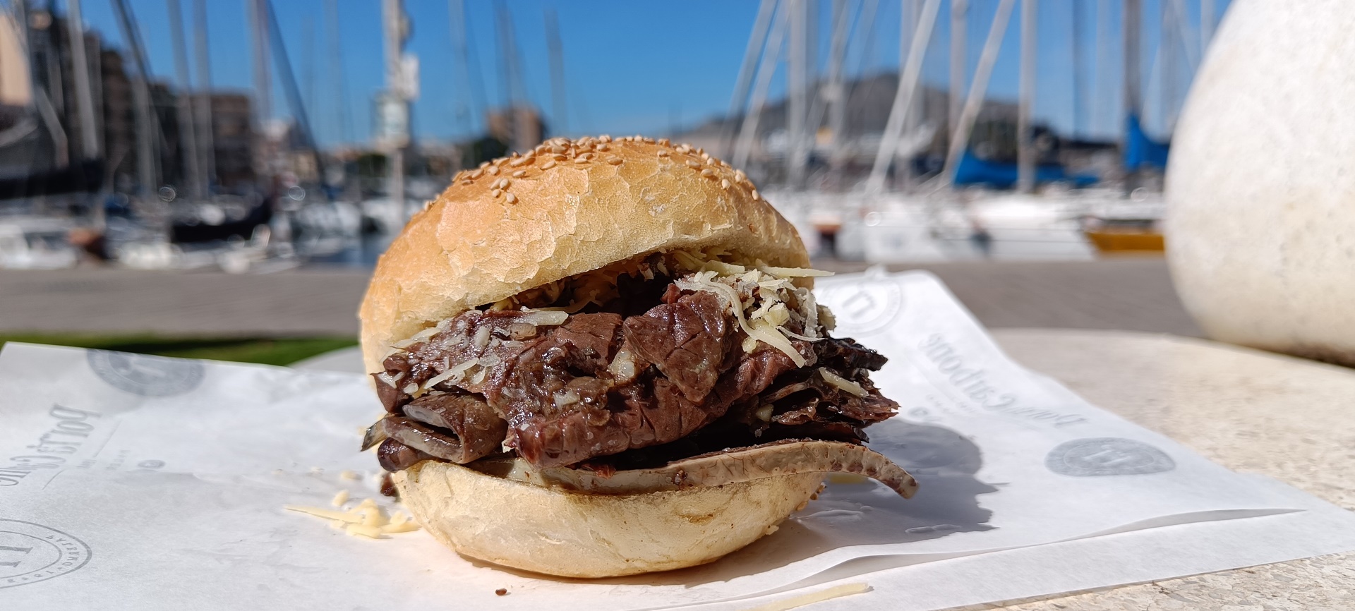 Sono presenti dei tavoli all’esterno, ma il consiglio è quello di consumarla sulle panchine della Cala (un semaforo pedonale vi consentirà di attraversare la strada), e godervi il panorama. Da qui sarà più facile riprendere il vostro itinerario ciclabile in direzione del Foro Italico dato che l’area è interamente pedonale.