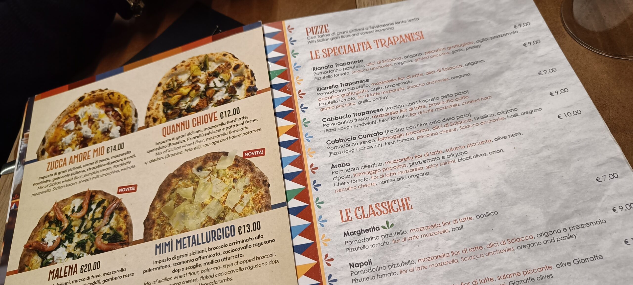 Particolare il menù dagli antipasti street food, alle pizze classiche fino alle stagionali che si distinguono per gli ingredienti del periodo. Non mancano i vini, con un’ampia varietà locale esposta lungo le pareti.