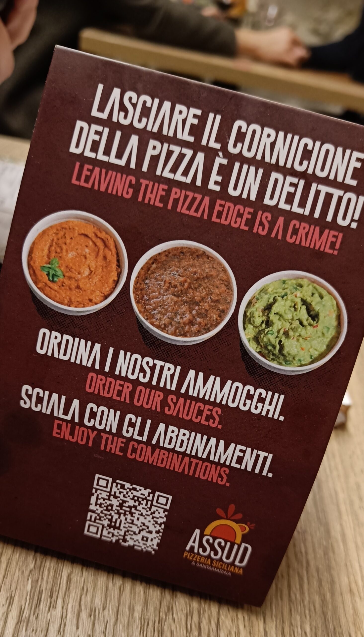 Ad acchiappare la nostra attenzione è espositore sul tavolo che invita a non lasciare il cornicione della pizza (è un crimine!), ma che potrà essere un motivo per accompagnarlo con ottime salse ordinabili.