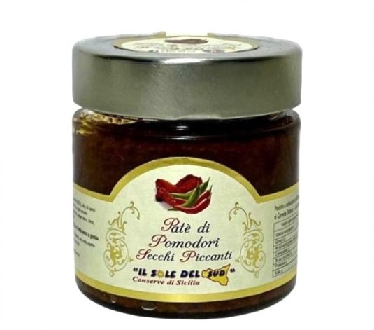 Ingredienti: pomodori secchi (55%), olio di semi di girasole, sale, peperoncino, misto aromi (aglio, olio, origano, ginepro, pepe nero, timo, basilico, rosmarino, salvia).